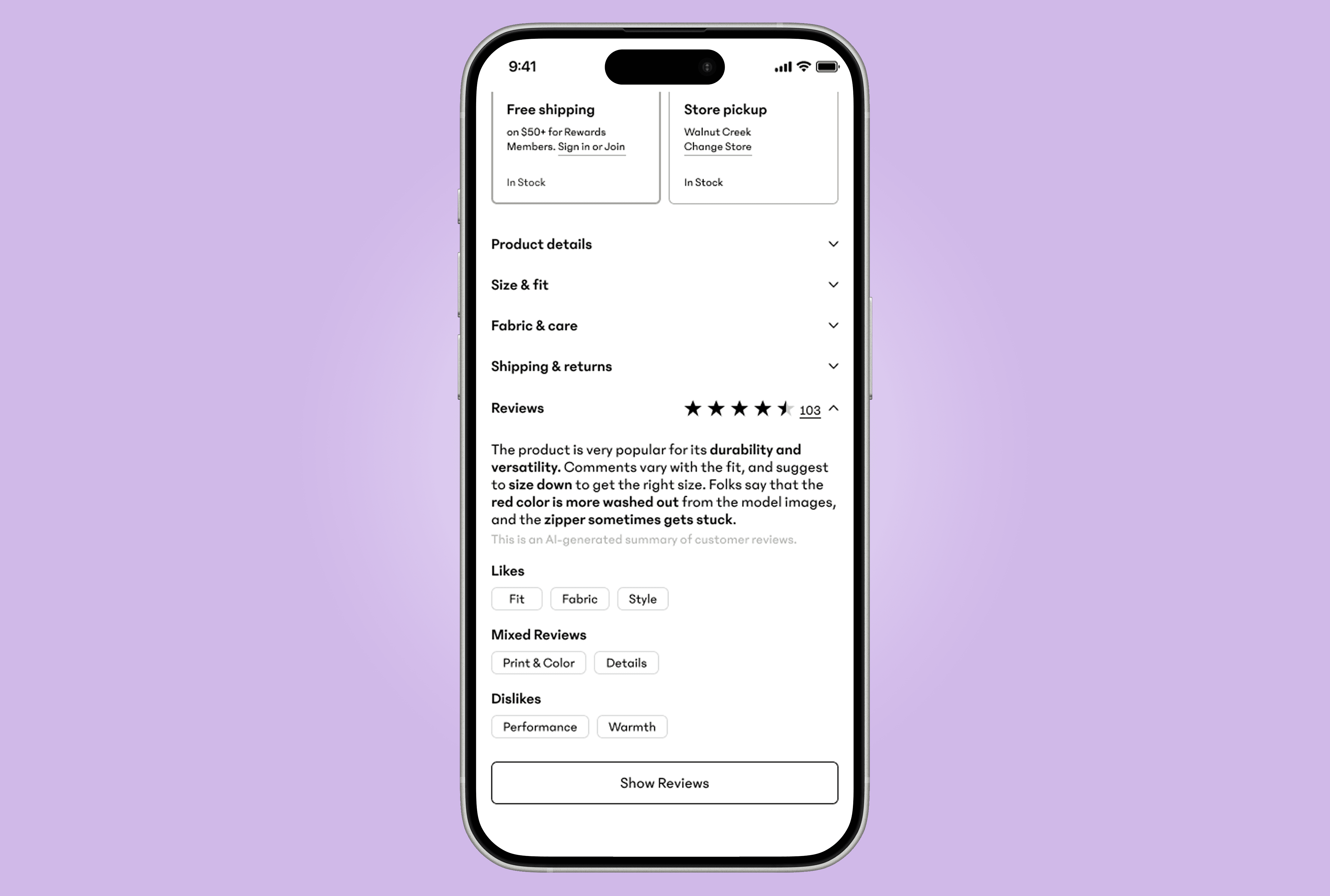 Reviews are a critical factor in any online clothing purchase decision, where interacting with reviews leads to a 10% increase in conversion rate. However, it can be tough to search through thousands of reviews. As a solution, I designed the company’s first customer-facing generative AI feature in a way that built trust.